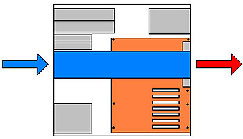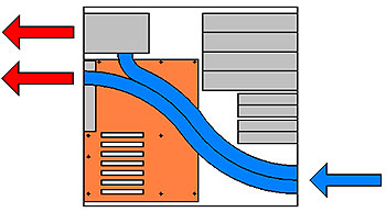 Расположение материнской платы. Классический вариант установки материнской платы в корпус формата АТХ предусматривает расположение блока питания в верхней его части, тем самым, поток воздуха от кулера блока питания направлен на процессор и модули оперативной памяти, что обеспечивает их дополнительное охлаждение. Сначала в соответствии со спецификацией АТХ от вентилятора блока питания требовалось нагнетать воздух в корпус, однако внутренние элементы блока питания сами достаточно сильно нагреваются в процессе работы, вследствие чего процессор обдувается уже струей горячего воздуха, тем самым не способствует эффективному его охлаждению. В последнее время вентиляторы блока питания вновь стали работать на отсасывание воздуха наружу, что, при наличии дополнительного нагнетающего вентилятора в передней части корпуса, обеспечивает сквозной поток воздуха, охватывающий почти все более или менее нагревающиеся элементы компьютера.